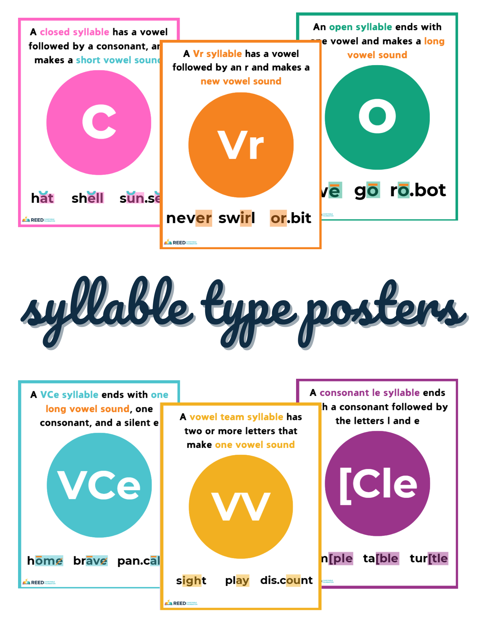 Our Concept Poster Pack includes our beautifully designed Syllable Type Posters and Word Division Posters. These classroom materials are perfect for helping students understand and master the six syllable types (Closed, Open, VCe, R-Controlled, Vowel Teams, and Consonant+LE) and five word division patterns (Rabbit, Turtle, Tiger, Camel, Lion).