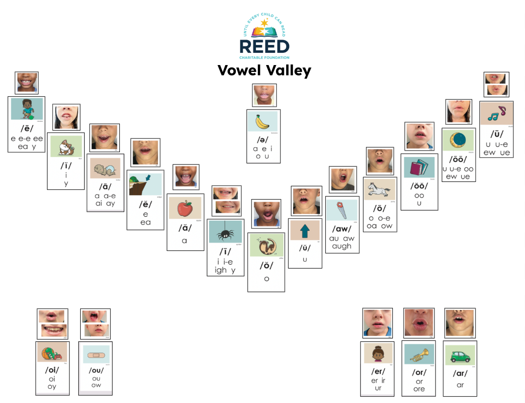 Sound Wall Cards - This product includes a sound card for each of the 44 phonemes in the English language categorized by a Vowel Valley and Consonant Wall. Each card includes a full-color image of the keyword and the most common graphemes listed below with optional add-ons for advanced spellings. In addition, you will receive high-resolution photographs of mouth placement to provide a visual for sound articulation.